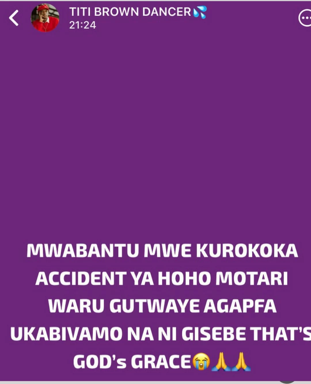 Umubyinnyi ukunzwe mu myidagaduro nyarwanda, Titi Brown, yatangaje inkuru ibabaje ariko inagaragaza igitangaza cy’Imana, aho yarokotse impanuka ikomeye y’imodoka yo mu bwoko bwa HOWO yari yagonganye n’umumotari bari kumwe.
